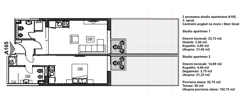 Daire, 3. katta yer almakta olup, 52,75 m² iç alan + 50 m² teras (toplam 102,75 m²) büyüklüğündedir ve merkezi deniz manzarasına sahiptir! Daire, Spa ve Wellness Merkezi’nin bulunduğu katta yer almaktadır. Bu tip her daire, iki girişli, iki banyolu, iki uyuma alanlı ve merkezi deniz manzarasına sahip iki teraslı, birbirine bağlı iki stüdyo daireden oluşmaktadır. 50 m² büyüklüğündeki teras, 25 m²’lik iki ayrı terasa bölünebilir ve her terasa 2×2 boyutlarında birer jakuzi havuzu yerleştirilebilir.