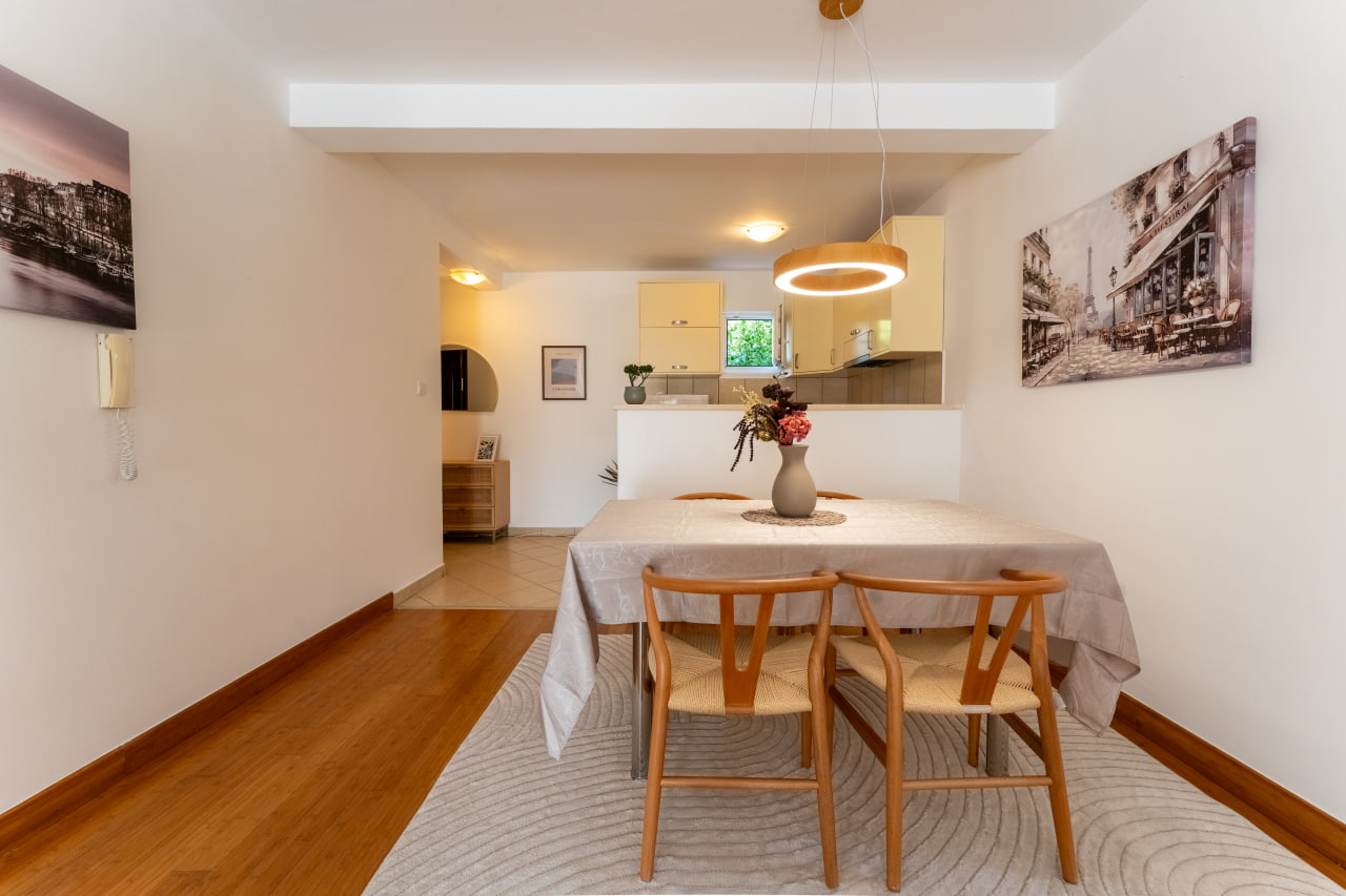 Karadağ’ın şirin sahil köyü Przno’da, 68 m² büyüklüğünde sıcak ve konforlu bir daire. Üçüncü katta bulunan dairede: